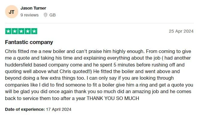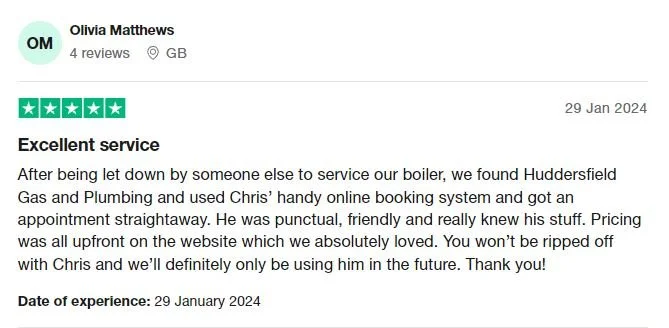 "I recently had my boiler serviced by Huddersfield Gas & Plumbing, and I couldn't be happier with the service. The technician arrived on time, was very professional, and answered all my questions thoroughly. I would definitely recommend them for a reliable service."