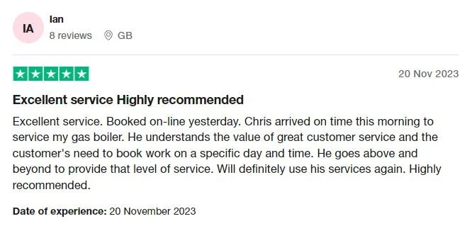 "Excellent service from start to finish. Booking was simple online, and the follow-up from the team was prompt. The installation of my new boiler was done flawlessly, with minimal disruption. Highly commendable service."